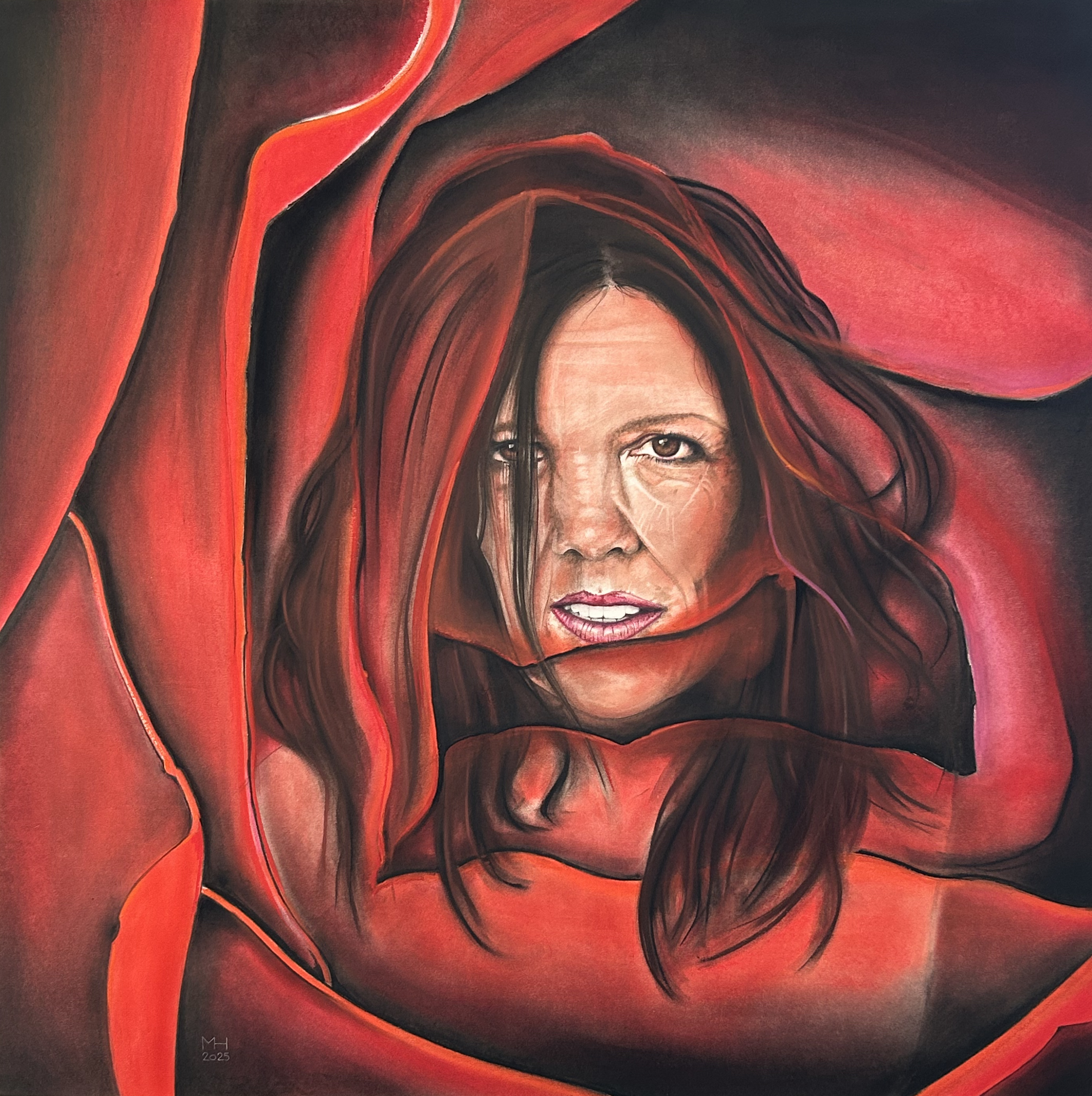 No. 099 - 2025 Nathalie in der RoseKohle, Kreide und Farbstift H 1000 mm B 1000 mm